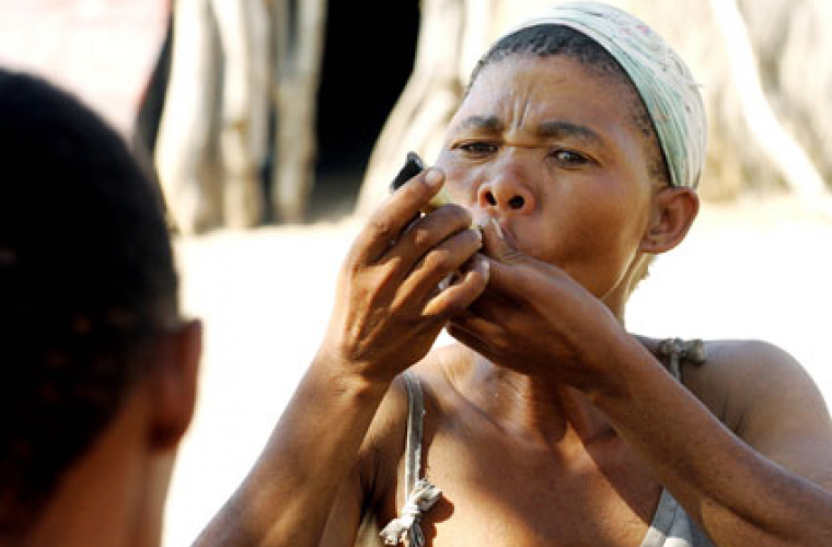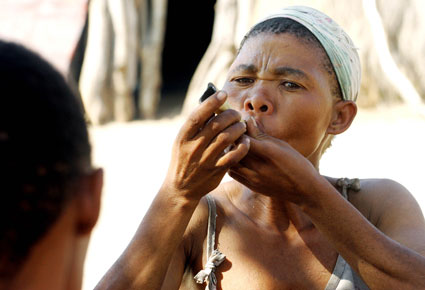 • röker pipa i byn Metsiamenong i Kalahariöknen. 30 personer från sanfolket bor kvar i naturreservatet. De väntar på dem som regeringen har kört bort. Sanfolket är känt för sina målningar på berg. De är även kända för sin kunskap om hur man klarar sig i n