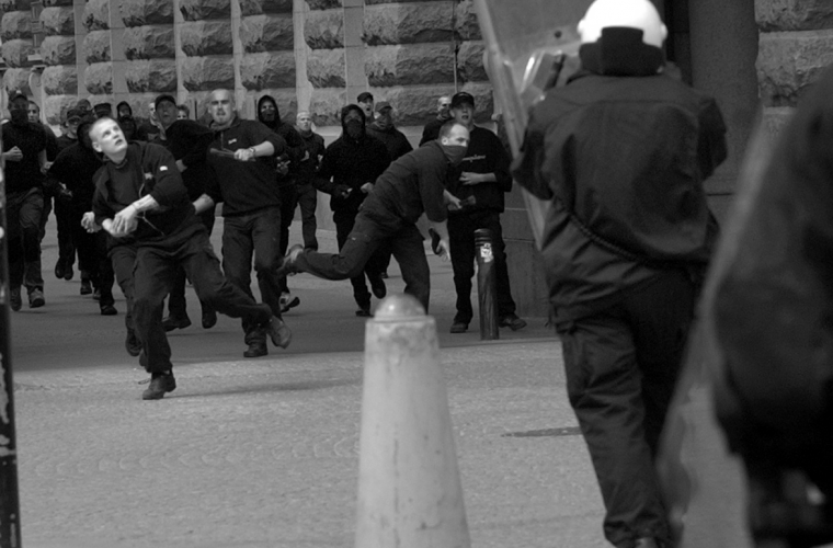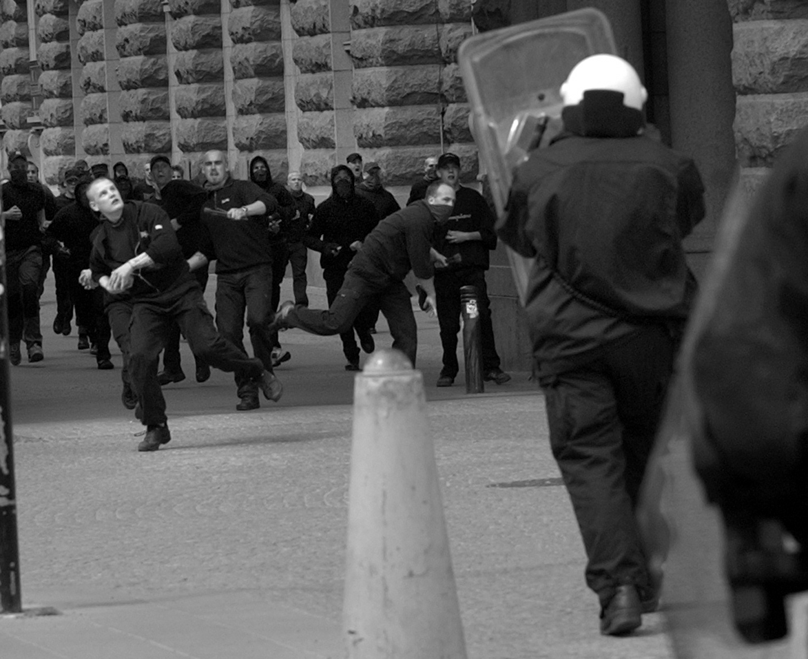 Försök från nazisternas sida att återigen med tillhyggen som flaskor och stenar attackera fredliga demonstranter misslyckades då polisen såg till att hålla dem borta från Mynttorget. Polisens presstalesman Björn Pihlblad poängterar att Afa och de andra grupperna skötte sig 'jättebra'.