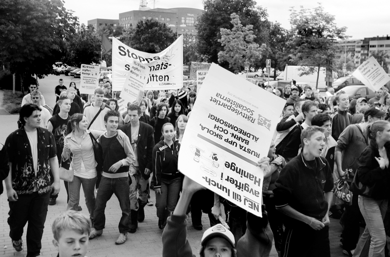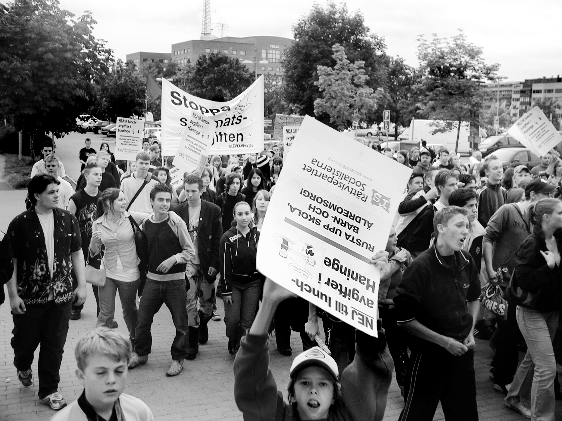 • Ett hundratal elever protesterade i måndags mot Haninges skolmatsavgifter om 500 kronor per termin. En avgift slår hårt mot fattiga familjer, menar ma