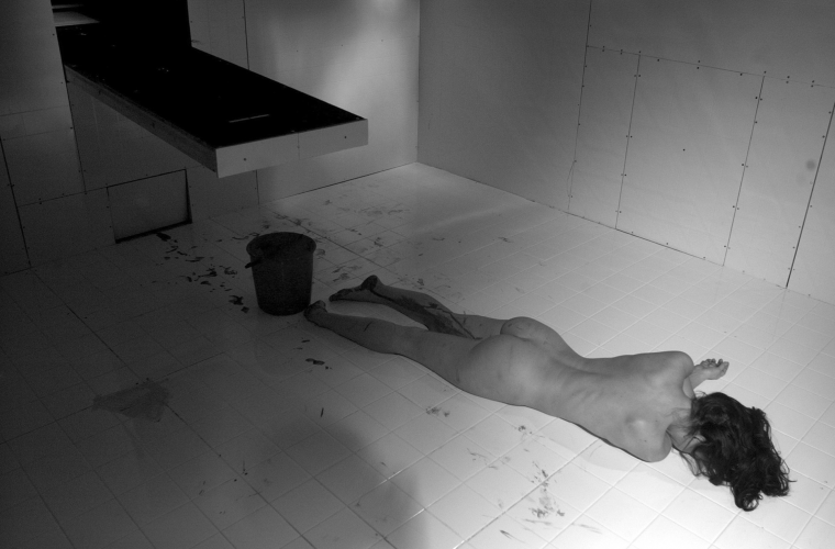 Youlian Tabakovs scenografi består av ett slutet rum med vita väggar och golv i kakel - lätta att torka av.