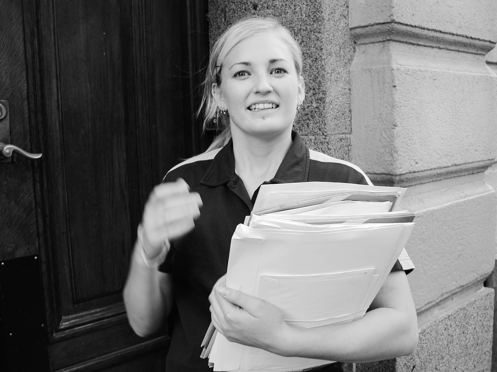 Under Thereses runda ska hon in i 30 trapphus. Varje uppgång har i genomsnitt 20 brevinkast. En lätt dag har hon en överkomlig bunt brev på armen, en tung dag ska hon utöver det dela ut ett halvt kilo reklam per hushåll. Det innebär tio kilo mer att bära per uppgång - i genomsnitt. Är det då dessutom fredag ska hon också dela ut Metro hus och hem som väger 200 gram per styck. Då har hon alltså 40 kilo till per trappuppgång att bära med sig.
