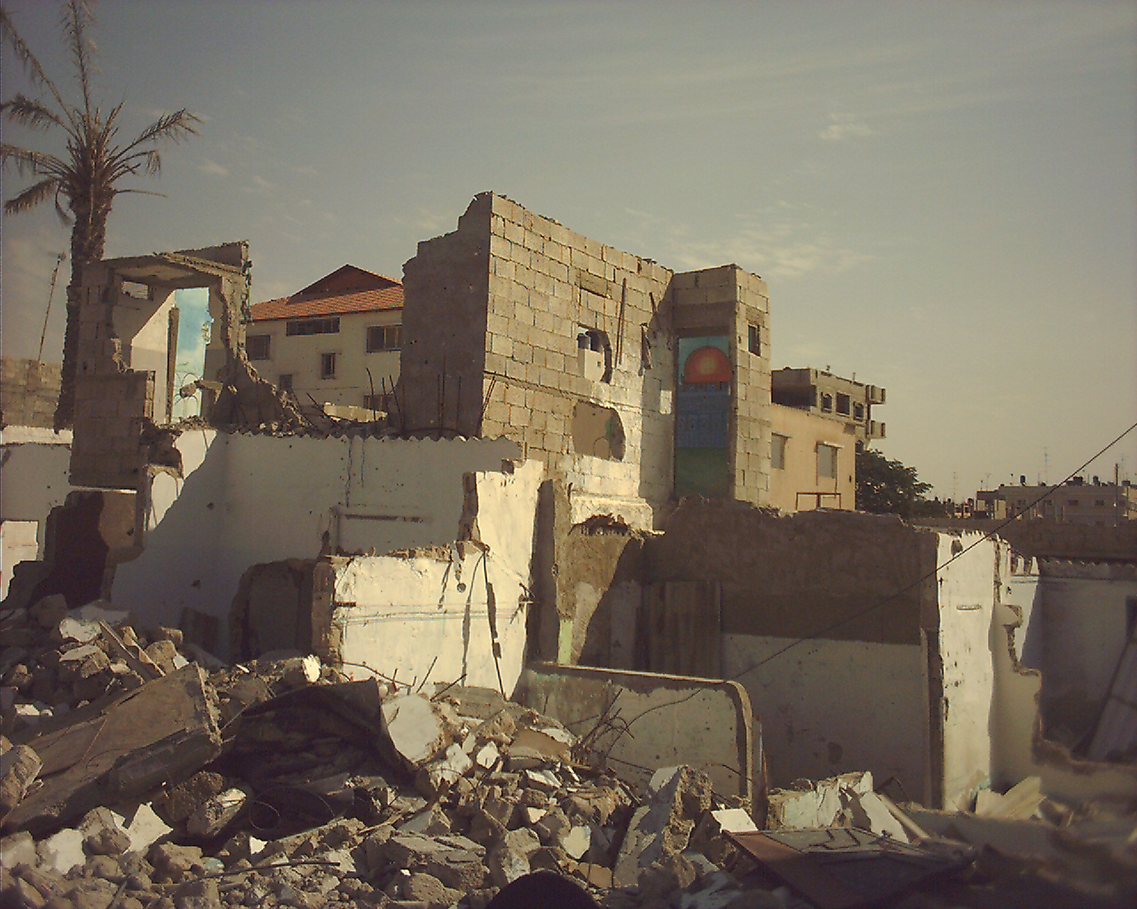Närmast gränsen står ett hus i ensamt majestät, omringat av ruiner. Av ödets nyck har det motstått grävskopornas vassa blad och vakttornens grovkalibriga eld. Till väster blottar de jämnade husen horisonten, där den omtalade bosättningen Gush Qatif sträcker sig längs stranden och tar havet i anspråk, till öster, likt ett spräckt granatäpple, innanmätet av en konstateljé. På en halvt raserad vägg påminner Klippmoskén om sin närvaro. Rakt söder ut skyms sikten av järnmuren med en igenbommad öppning för pansarvagnar. Likt Colosseum väntar den på att släppa loss odjuren. Norrut slumrar Rafah i drömlösa nätter, fasaderna är perforerade av kulor, fönster och balkonger sedan länge igenmurade.