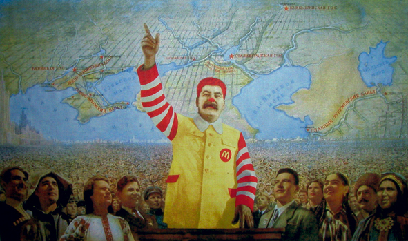 Säkerhetsvakter med öronsnäckor, souvenirförsäljare, högar med skräp, feta hamburgare, moln av cigarettrök, Coca-Cola, Budweiser och tusentals människor som rusar igenom dörrarna. Välkomna till ESF, European Social Forum, 2004.