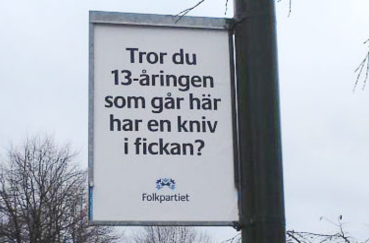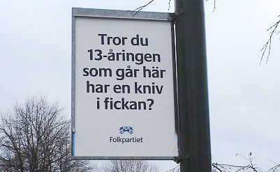 Med syftet att "ta Malmöbornas rädsla på allvar" trycker Folkpartiet upp reklam som inte lite påminner om ren skrämselpropaganda, en i politiska sammanhang vanlig och framgångsrik metod. I välbärgare områden som Limhamn, Erikslust och Djupadal pryds gatuskyltarna med texter som "Känner du dig trygg på den här gatan?" och "Tror du att 13-åringen bakom dig bär kniv" och mitt ärliga svar är givetvis; Ja, jag känner mig trygg på den här gatan och nej, jag tror inte att 13-åringen framför mig bär kniv.