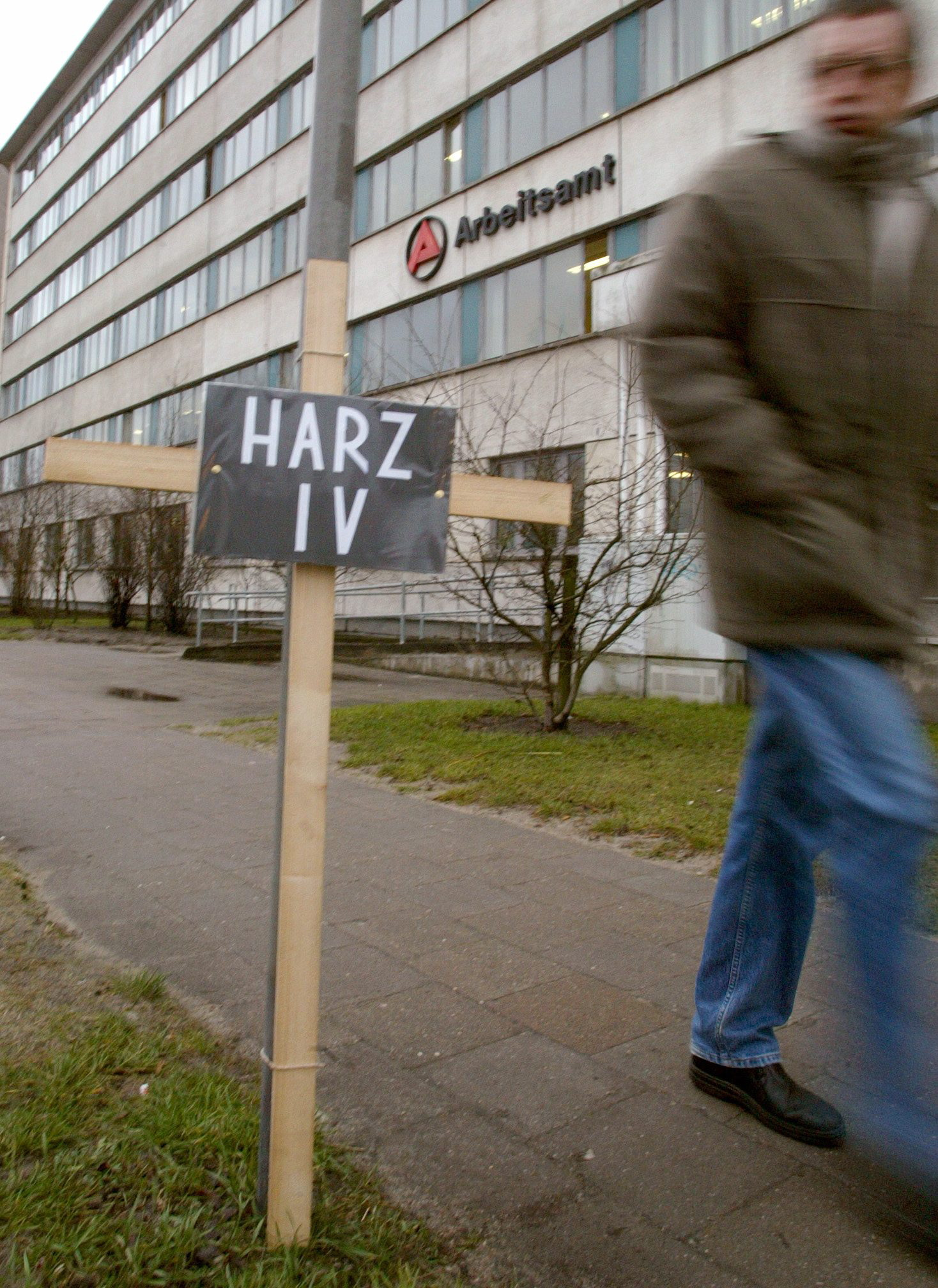 • Ett kors utanför arbetsförmedlingen i staden Frankfurt an der Oder i östra Tyskland. Över en miljon långstidsarbetslösa har fått sina ersättningar kr