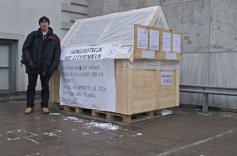 Den 6 december åt han en hamburgare. Därefter har han levt på vätska, blåbärssoppa och Apotekets multivitaminer. Magnus Axelsson är inne på sitt 50e strejkdygn. Sedan början av december bor han vid Klarabergsviadukten i knappt mer än en trälåda, inte större än två kvadratmeter. År 2001 förlorade han sitt jobb och nu vill han ha det tillbaka.