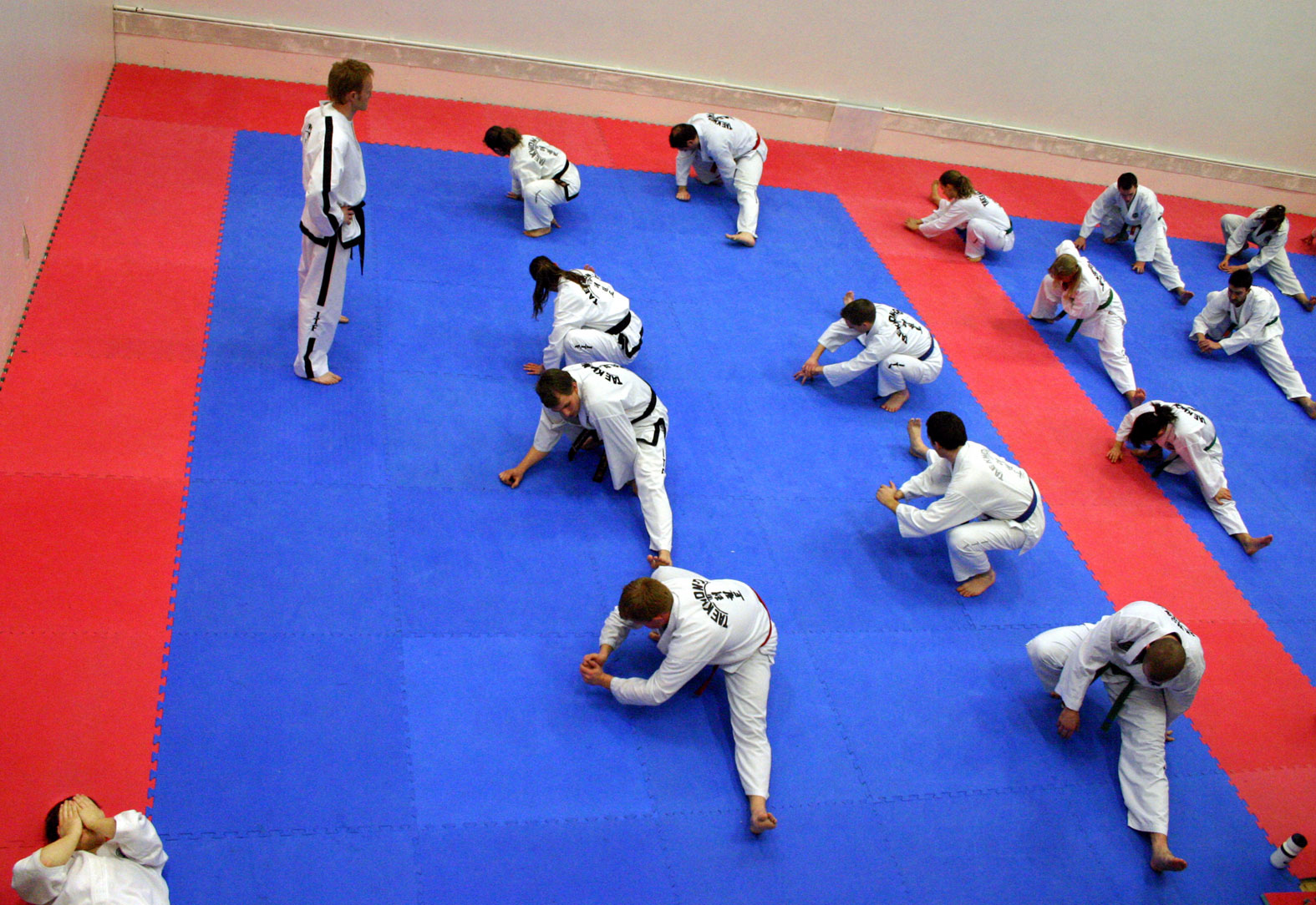 I hallen börjar kvällens träning med en uppvärmning som håller på ett bra tag. Hela kroppen gås igenom. Med tanke på sportens våldsamma inslag och explosiva rörelser är den inte särskilt skadedrabbad. Strax innan träningen har jag frågat Robert Andersson om de vanligaste skadorna inom sporten.