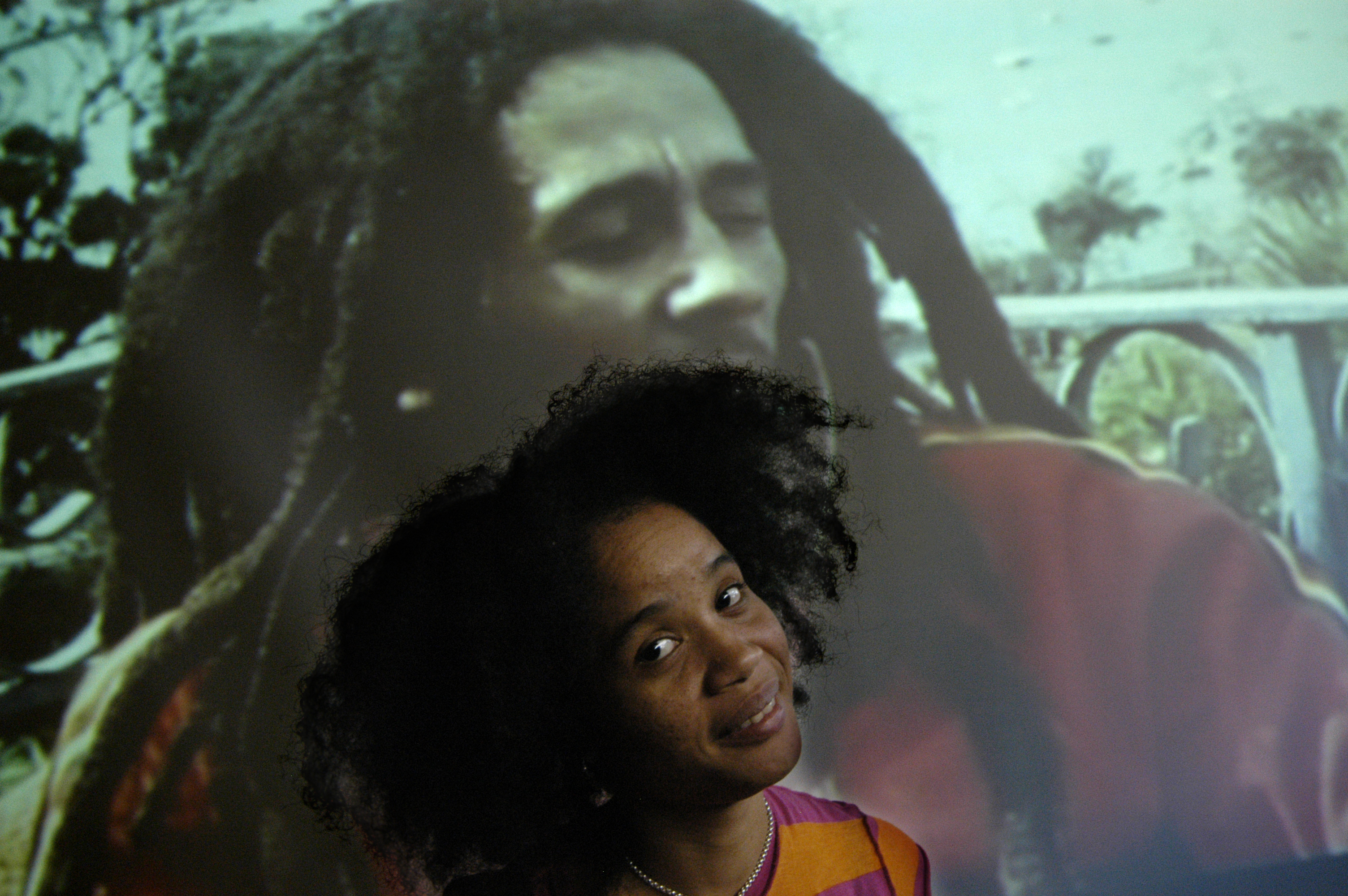 Staceyann tittar förundrat på Världskulturmuseets bildskärm som visar en Bob Marley film.