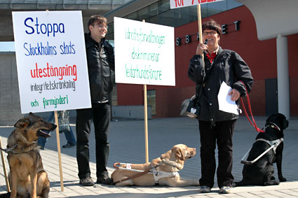 Vid lunchtid i onsdags, på Ledarhundens dag, genomförde medlemmar från Synskadades riksförbund, SRF, en manifestation utanför Eriksdalsbadets entré. Även representanter från Riksförbundet mot astma- och allergi var närvarande.