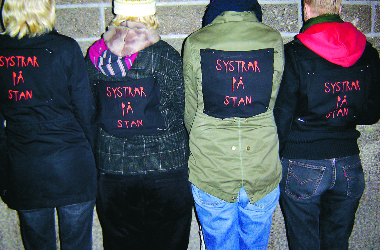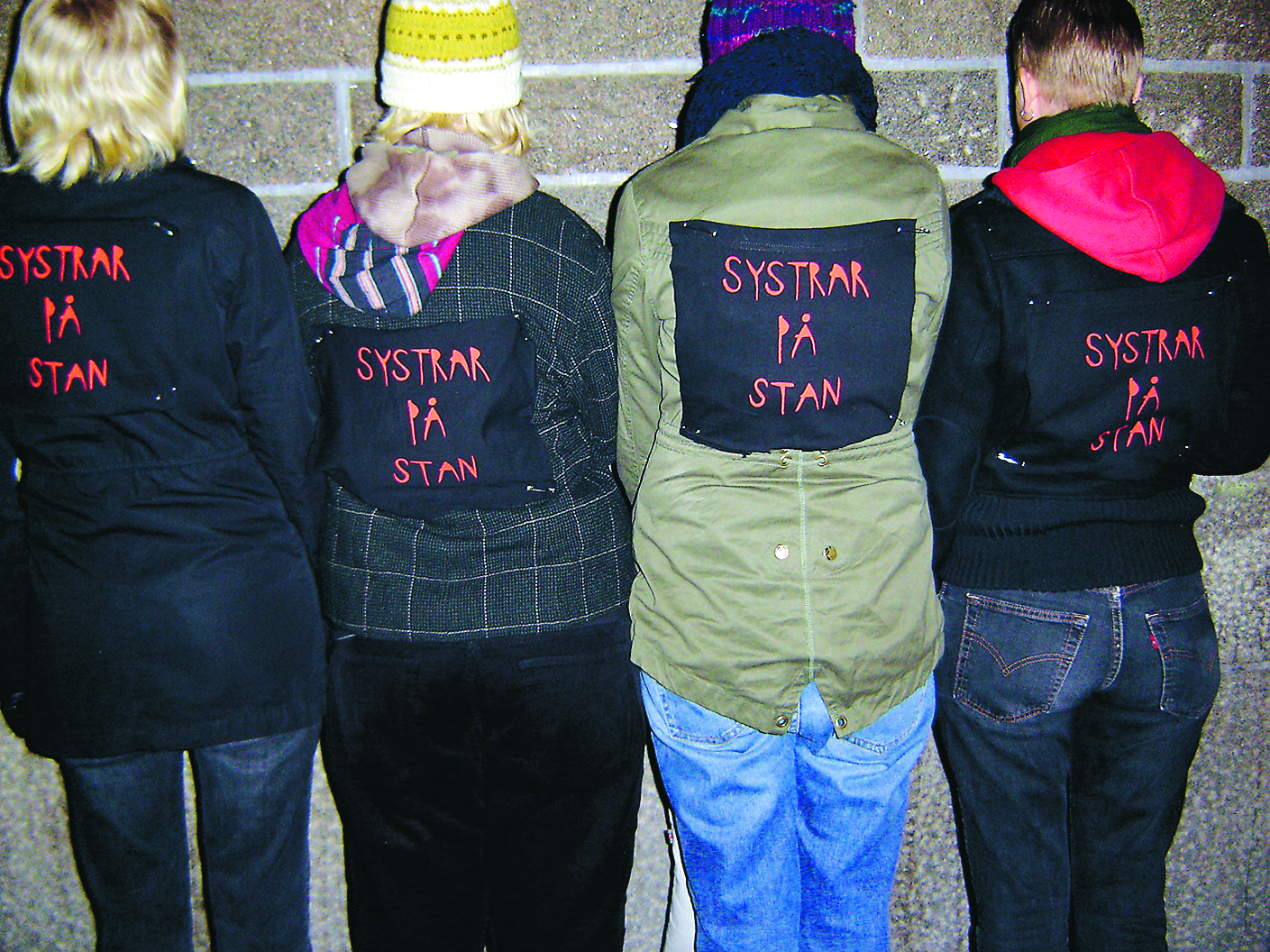 Hösten har kommit för att stanna och tjejerna sveper in sig i halsdukar och trär lager av tröjor över huvudet. Nu är det dags. Klockan är halv elva och vi kliver på en nästan tom tunnelbana. På vägen pratar de om hur frontfigurerna i Feministiskt initiativ, Tiina Rosenberg och Gudrun Schyman, dödshotats. Även en av de manliga styrelseledamöterna i Fi har hotats och kallats könsförrädare.