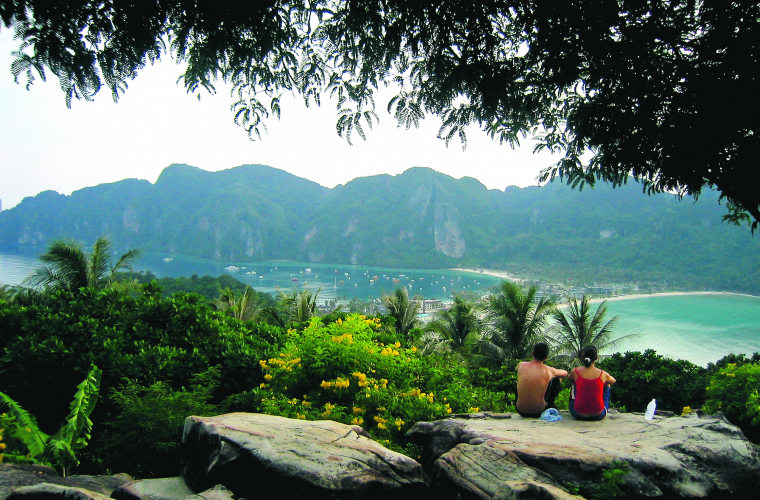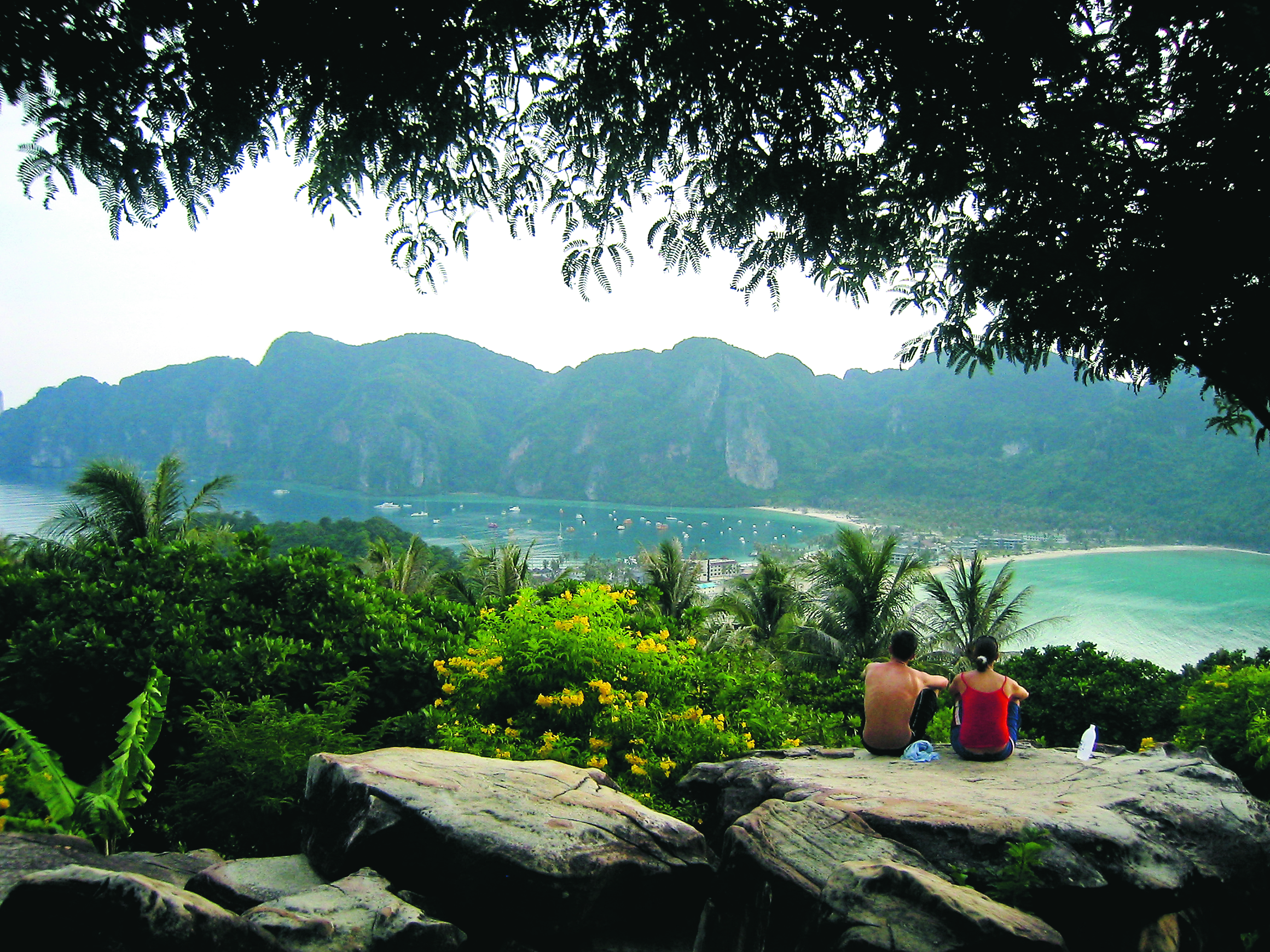 Jag går de nära fyrahundra trappstegen upp till utsiktsplatsen, viewpoint, och häpnar över den vackra vyn, den massiva grönskan, den smala landremsan som löper mellan de höga bergen, de båda halvmåneformade stränderna, det skimrande havet. Det var hit upp många tog sig när tsunamin kom. Här satt de på natten, rädda för nya vågor och oroliga för sina anhöriga. I ett hus här på berget kan man på video få se hur det såg ut på Phi Phi den morgonen och jag ber paret som bor där att visa filmen. Det är svårt att hålla tillbaka tårarna.