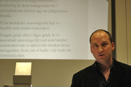 Henrik Ahlenius, doktorand i praktisk filosofi vid Stockholms universitet, talade om dilemmat med att bedöma djurförsök utifrån etiska grunder. Att väga det lidande försöken orsakar mot dess eventuella nytta är svårt. Särskilt i en forskningsvärld där framgångsrika resultat aldrig kan garanteras.
