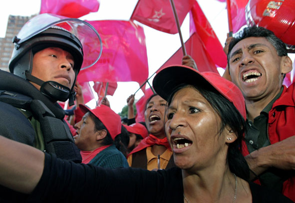 I en rondell i närheten av La Paz universitet närmar sig paraden en kampanjgrupp från motståndarna MAS och kravallpolis ställer upp en linje mellan antagonisterna. Kampen om strategiska positioner i staden har gått till direkt fysiskt handgemäng tidigare. MAS spelar andinsk folkmusik i sina högtalare och över det håller den lokale parlamentskandidaten tal.