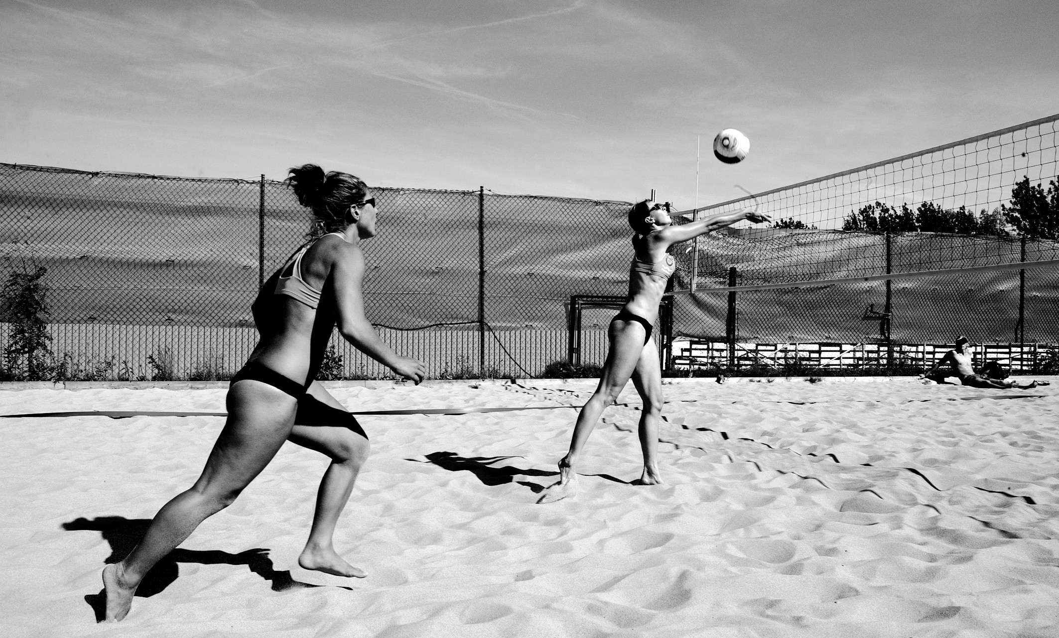 Sanden yr omkring de barfota tjejerna som värmer upp på Göteborgs beachvolleyboll clubs utomhusbana i Åby. I ett allt intensivare tempo bollar de till varandra.