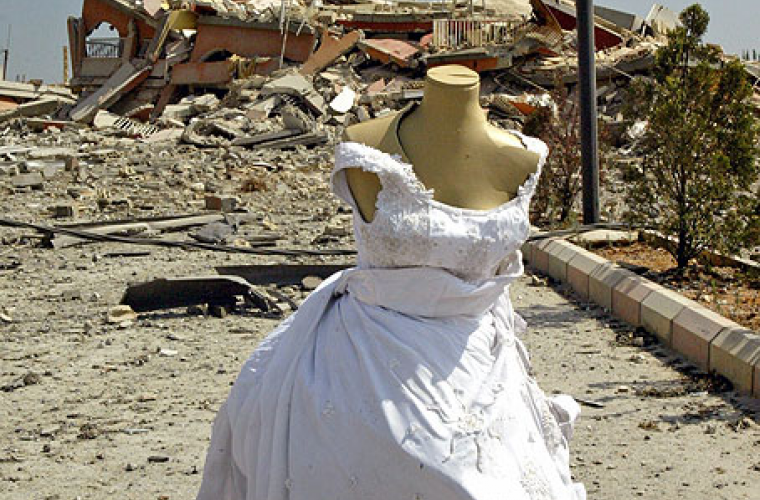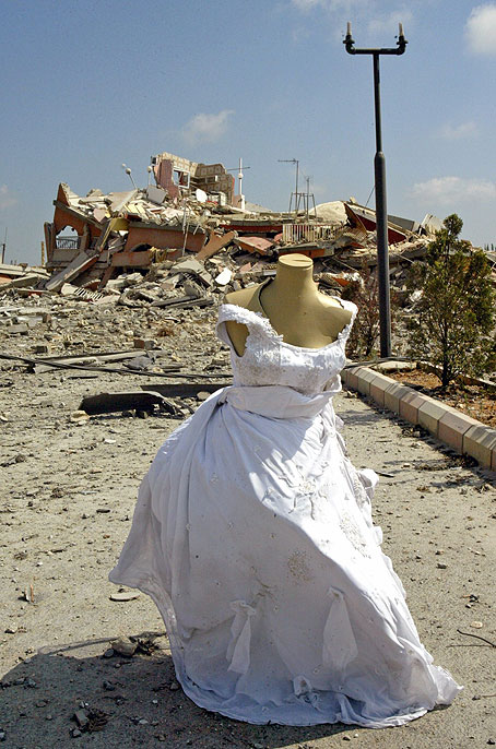 • En skyltdocka klädd i en bröllopsklänning står i närheten av platsen i Qana där minst 54 kvinnor och barn dödades i en israelisk flygattack i söndags.