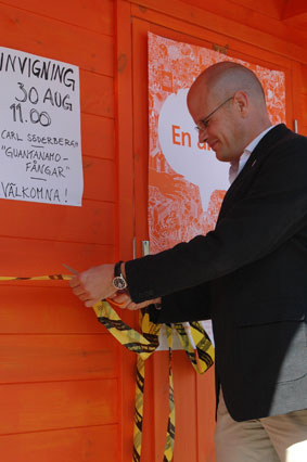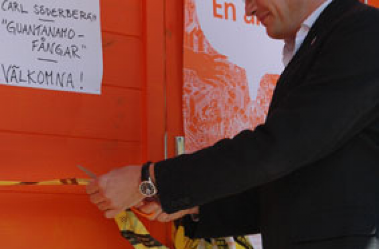 Trots att den står inklämd mellan folkpartiets och vänsterpartiets valstugor syns Amnestys friggebod - målad i klart lysande orange - tydligt. Härifrån vill organisationen informera politiker och allmänhet om tre av sina hjärtefrågor.