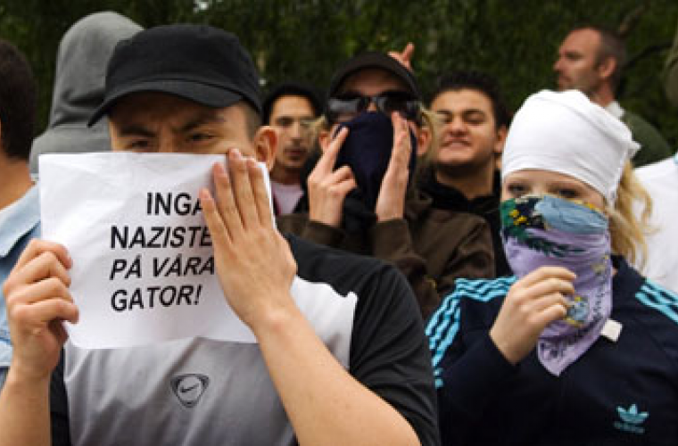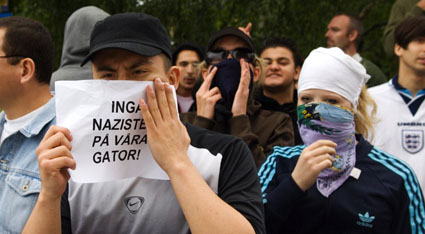 • Motståndet mot rasismen växer i Sollentuna. Bilden föreställer en demonstration mot Nationalsocialistisk fronts valmöte den 14 juni i år.