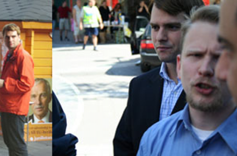 På bilder från mötet syns bland annat partiets toppkandidat Marc Abrahamsson. Till vänster om honom står en person som under denna valrörelse inte enbart arbetat för Nationaldemokraterna utan även för folkpartiet.