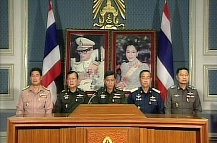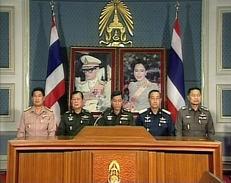 Strax efter midnatt stoppades sändningarna från kabelkanaler som BBC och CNN och den statliga teven spelade den thailändska kungen Bhumibol Adulyadejs hymn, visade bilder kungen och sände ett tal där arméchefen Sondhi Boonyarakkarin sa att premiärministern hade störtats och att krigslagar införts.
