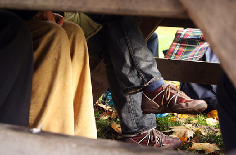 I dag faller regnet oavbrutet ner från den gråtunga himlen. Ändå sitter åtta personer samlade vid ett bord med tillhörande bänkar, längs backen upp mot Drakenbergsparken.