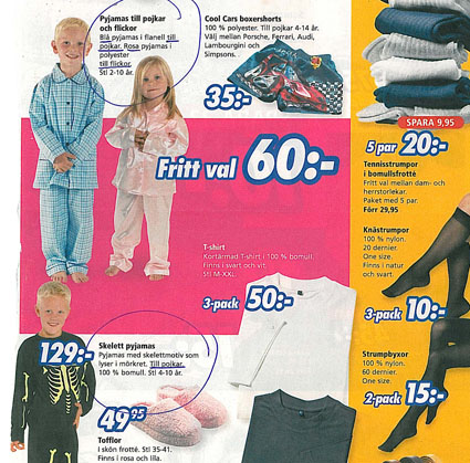 I en broschyr med erbjudanden inför den stundande julhandeln gjorde företaget reklam för ett antal olika pyjamasar. En blå och en skelettmönstrad, som enligt reklamen var till för pojkar, samt en rosa för flickor.