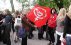 Gabriella Martinson och Frida Hallén från Team för våldtagna kvinnor vid Alla kvinnors hus höll i demonstrationen mot den friande domen i Tumba-målet utanför Rosenbad i tisdags.